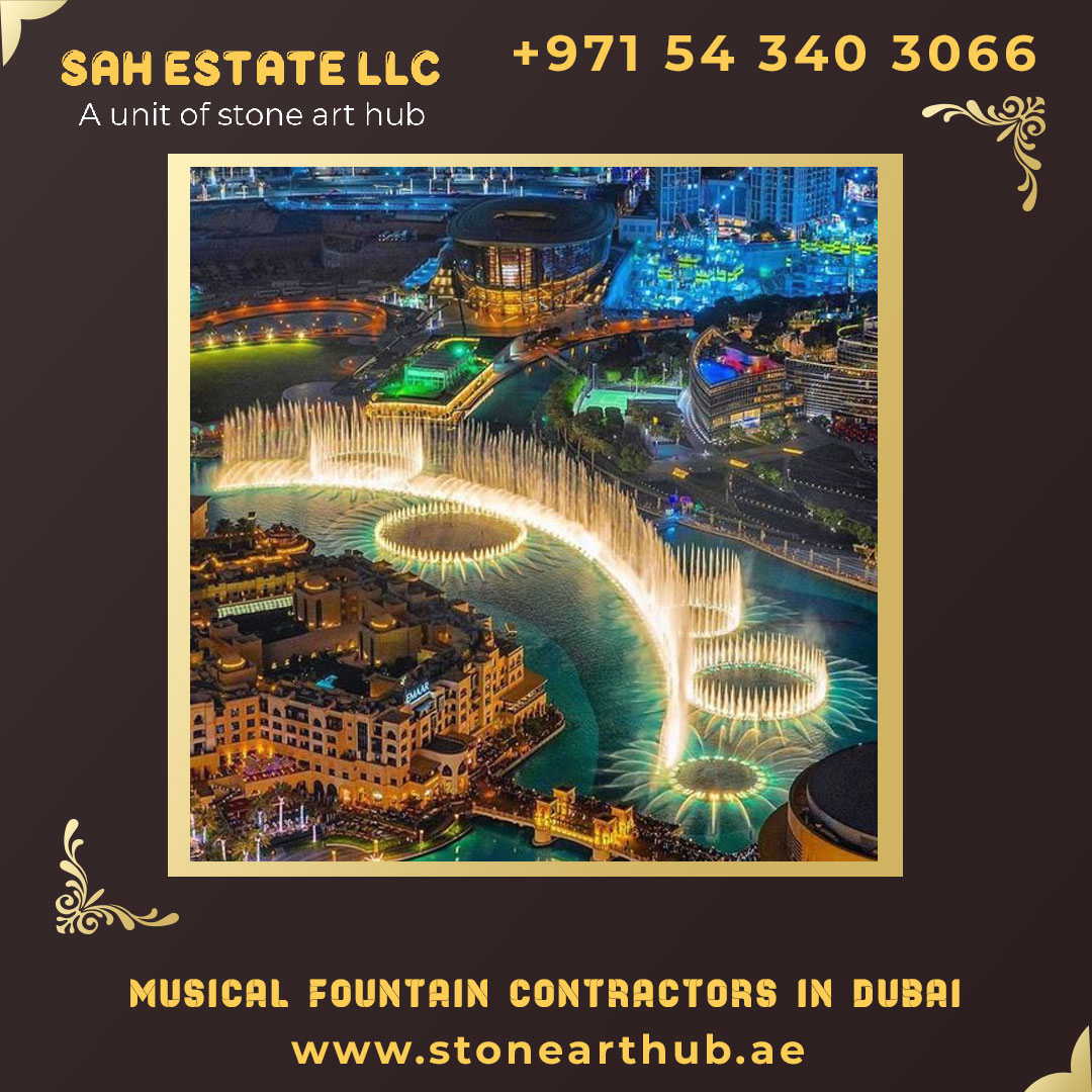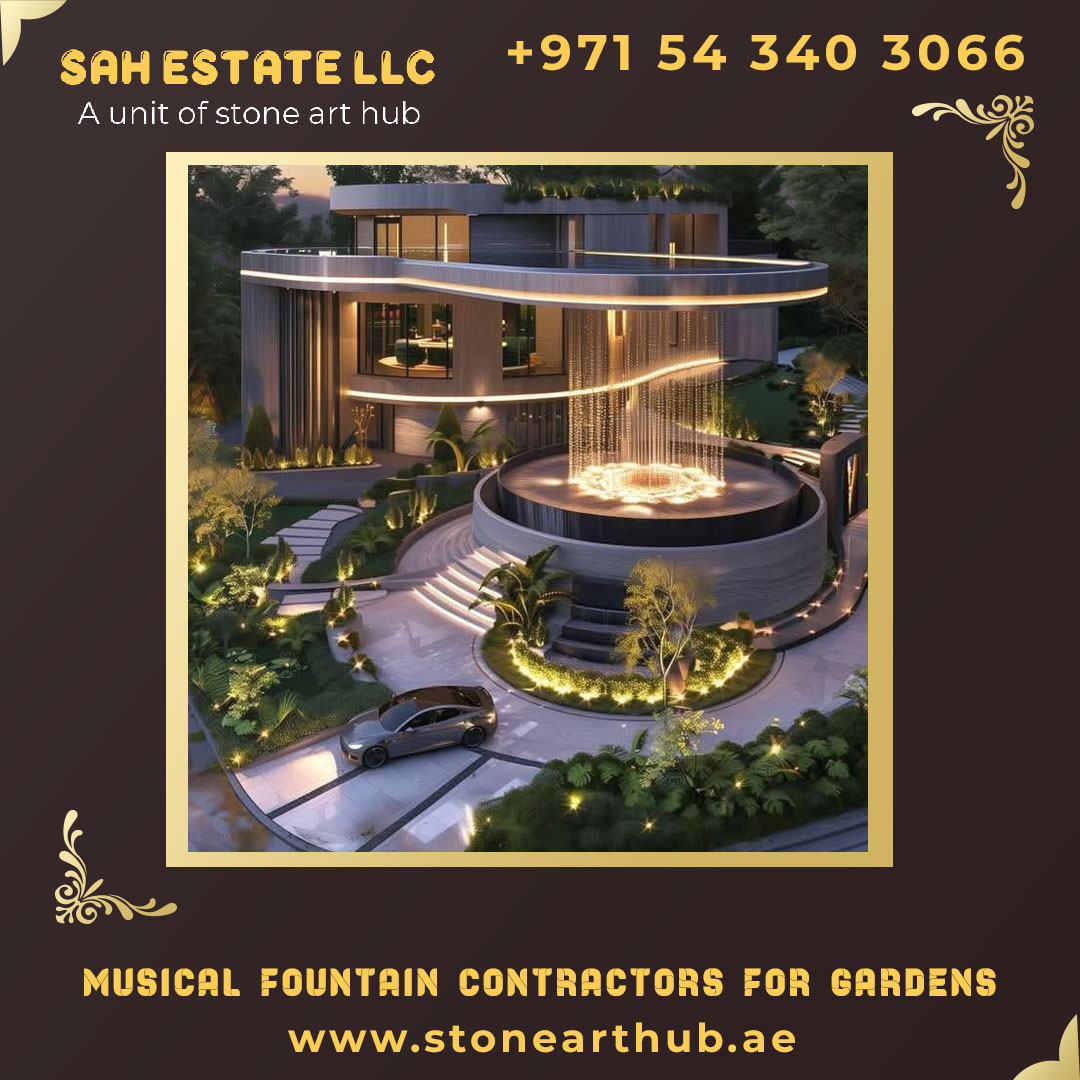 Our team installs elegant musical fountains for villas in Dubai, including entrance, driveway, courtyard, garden, poolside, and rooftop fountains, combining luxury, automation, and water-light-music integration for a memorable outdoor experience.